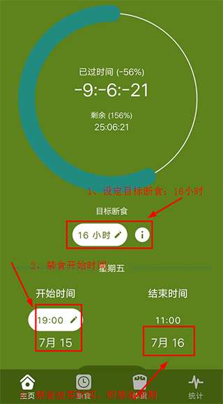1、点击首页下方固定禁食时间段,设定禁食开始时间,即可开始计算禁食时间。