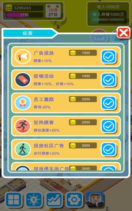 3、至少每天都有一些小任务,等着你去完成,多多投放广告以及做活动来吸引客人们。