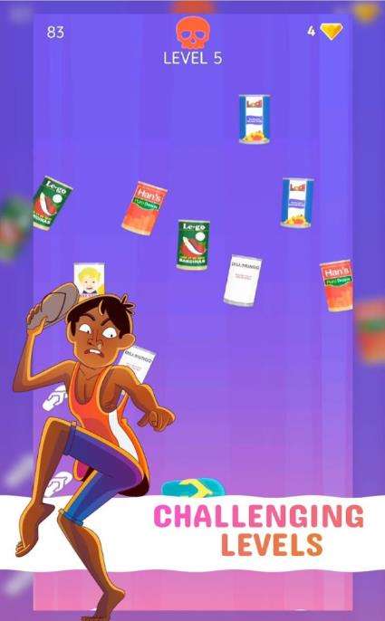 罐头挑战这款游戏中主要的操作就是解锁不同的拖鞋,然后去接打罐头,注意看在屏幕的上方,会不断的向下掉落,不同品牌的罐头,需要控制,然后快速点击,把这些罐头都拍打清除干净,获得的分数越多,你的奖励就会越高,为什么要拍打掉?因为拖鞋被他们拿在手上,脚上没有保护措施,罐头掉下来可能就会砸到脚,再就是有些会不断的提供一些不同风格样式的拖鞋给大家。