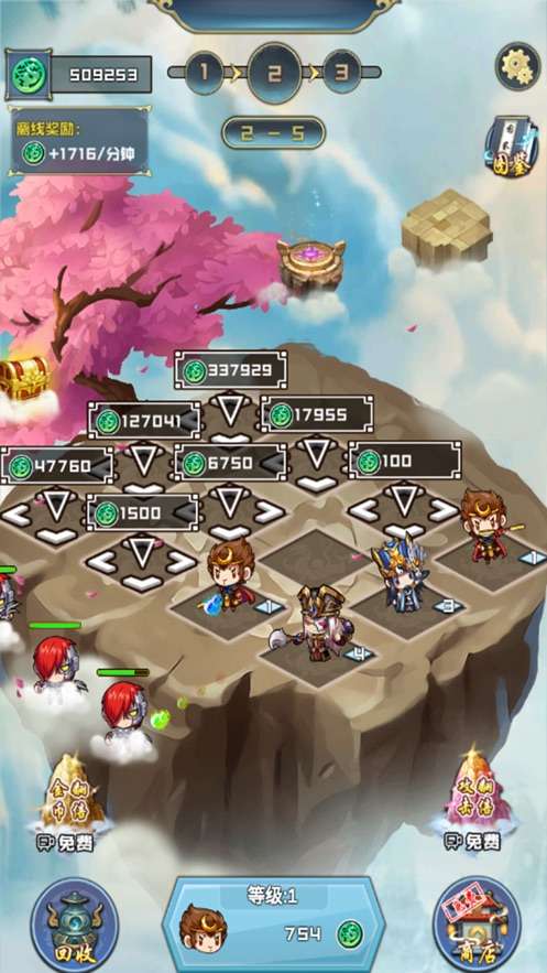 2.每个场景中都会存在着很多的怪物需要你去消灭,多多使用金币解锁更多的阵容位置进行作战。