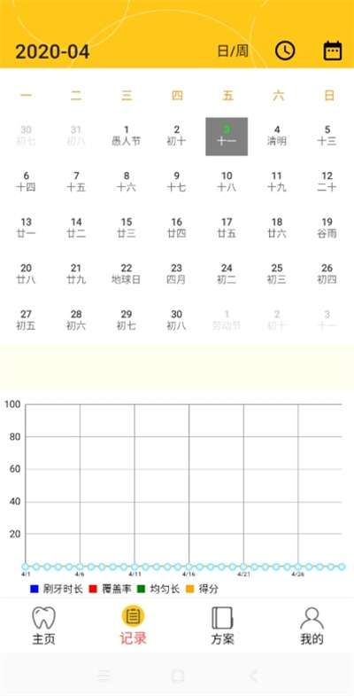 3.进入应用程序的记录中心,并能够在一周内查看刷牙数据。