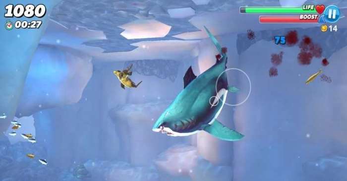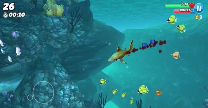玩家控制鲨鱼进入海中猎食,根据鲨鱼的型号会限制玩家可以猎食的对象,鲨鱼的生命值会不断下降,所以玩家只能让持续猎食。