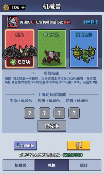 通过关卡战斗和商店购买,可以获取【机械勋章】道具,刷新并兑换机械兽,所以在前期要每天持续参与关卡战斗,积攒【机械勋章】道具,将机械兽提升到红品级别来提升更高水平的技能。