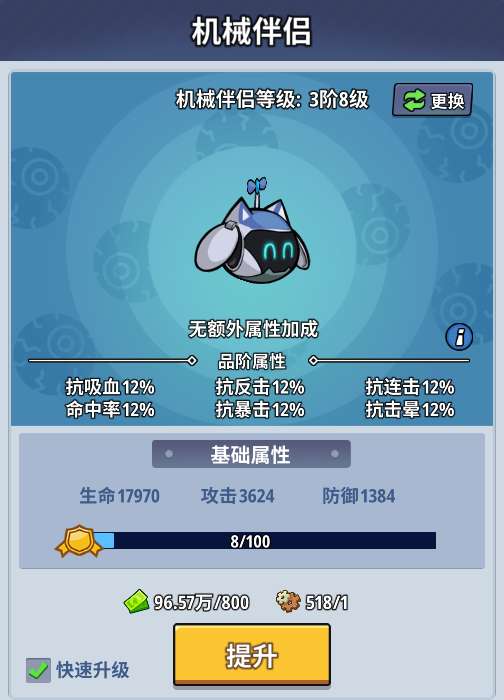 所以为了提升该类型的词条属性,要持续对机械伴侣进行培养,通过竞技场获取【零件】道具提升机械伴侣的基础属性和品阶属性,解锁上述词条。