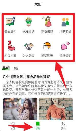 4、在“求知”页面可选择美文美句、穿衣搭配、求职面试等多个分类,点击进入即可查看相关文章与内容。