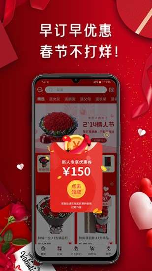 1、点击首页,有生日送花等精选推荐,还有领红包、新品专区等福利,界面简洁且功能丰富。