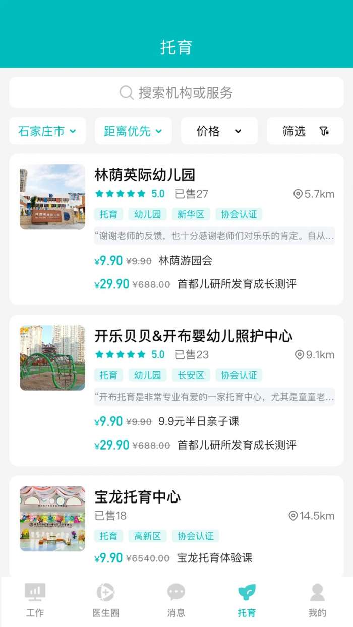 5、托育栏目提供幼儿园与照护机构信息,支持筛选距离、价格等条件便捷查找。