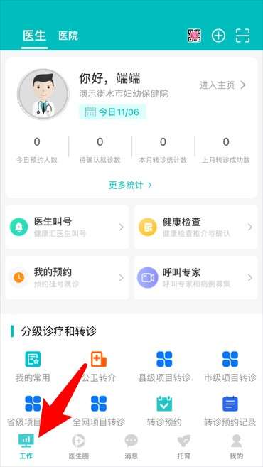 2、医生工作台集中展示预约数据、转诊入口、健康体检与医生码等高频功能模块。