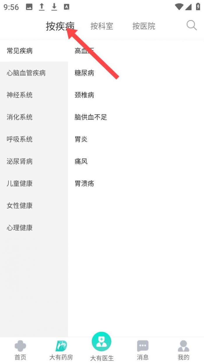 3、疾病查询页面分类很好。左侧列出常见病、心脑血管疾病等,右侧则对应高血压、糖尿病等病症,方便用户快速查询疾病,获取专业的医疗咨询和健康知识。