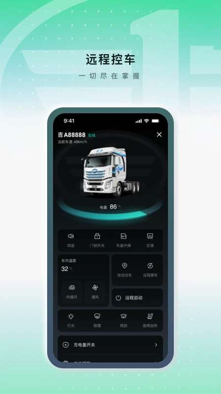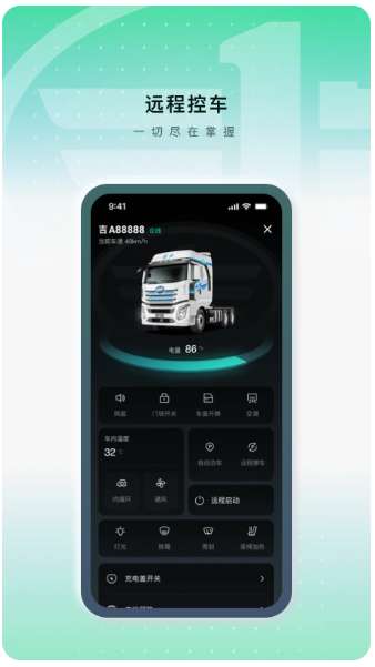解放行蓝途版主要面向车主和司机用户的APP,为接入解放行驶网络的商用车用户提供多种免费服务。 通过该APP应用,用户可以轻松获取车辆状态、遥控车辆、能耗信息、开机地图等功能,用户可以在线控制车辆门锁的开关,并可以对车辆门锁进行一键解锁和一键关闭操作。可以在线控制车辆的车窗升降,直接在线控制车窗升降状态。提供全方位的车辆管理和控制服务。