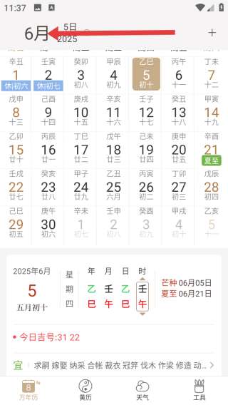 2. 年历页信息丰富,天干地支清晰,吉凶分明。景观插画增添了传统的韵味。查看吉日按钮,方便选择好时机。它帮助用户按照年历的习俗安排事务,让传统民俗辅助日常决策。