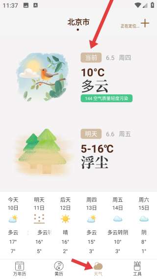 3. 天气页面上的当前天气和空气质量直观,并提供明天和未来几天的详细天气预报。点击天气选项卡切换到这里,获得准确的气象信息。结合日历和年历,为旅游和活动规划提供全面的参考。