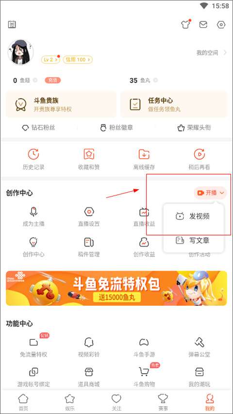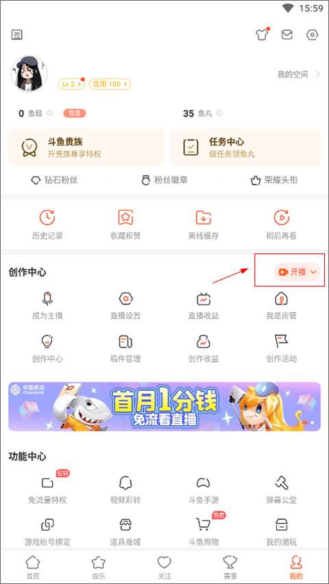 1、首先打开斗鱼,点击右下角【我的】,找到【开播】。