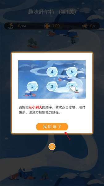3、页面弹出了这项训练的基本玩法,就是按照从小到大的顺序来依次点击冰块,用时越少就表示注意力控制能力越强,点击“我知道了”关闭窗口。