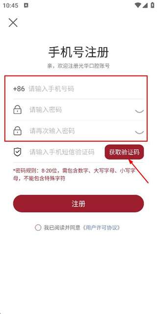 2、在帐户注册页面上输入您的电话号码和密码后,单击“获取验证码”按钮。