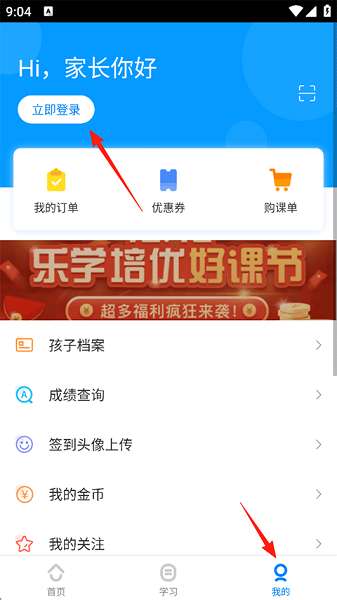 1、打开乐学培优APP,在我的页面点击立即登录。
