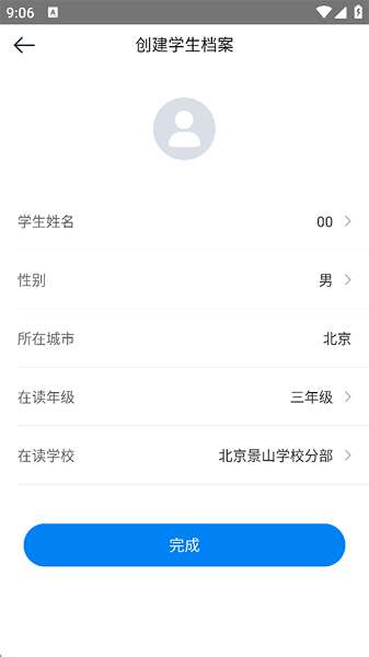 3、创建学生档案:填入学生/孩子姓名、性别、所在城市、年级以及在读学校,接着点击保存。
