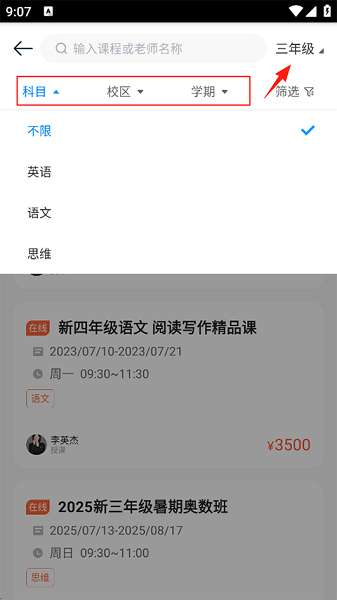 4、登录后可以在首页根据科目、校区、学期,以及右上角的年级切换来选择需要的课程。