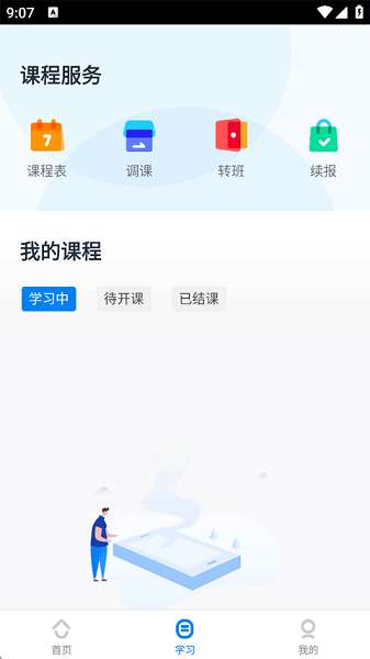 5、购买课程过后在学习页面会有生成的课程表、调课、转班以及续报等课程服务,还能查看孩子的学习状态。