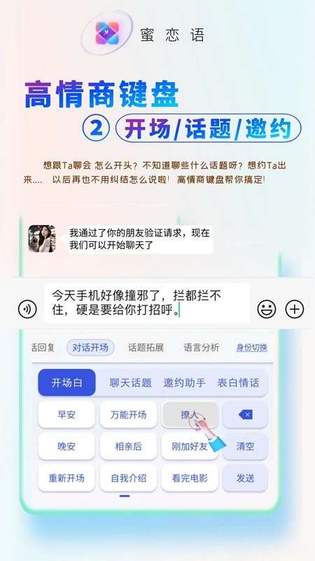 蜜恋语是一款受欢迎的高情商话术聊天软件,可以为用户提供大量的高情商话术资源库,随时自由选择浏览学习各种高情商话术,轻松享受优秀的使用过程参考,自由通过高情商的聊天来促进双方关系的升温,增加对方的好感,帮助用户轻松追求爱情,能完全满足所有使用需求,还提供全面的话术场景的选项,轻松更新各种热门且受欢迎 的聊天话题,可以助力用户打破聊天尴尬瞬间,轻松享受安全的交友聊天环境,有兴趣的用户欢迎来本站下载软件。
