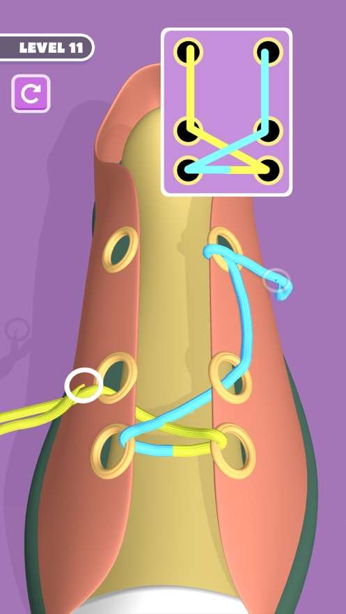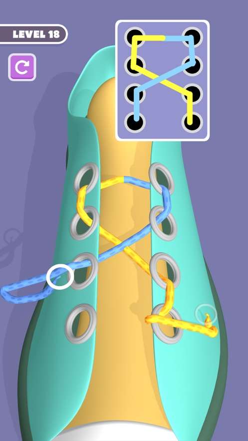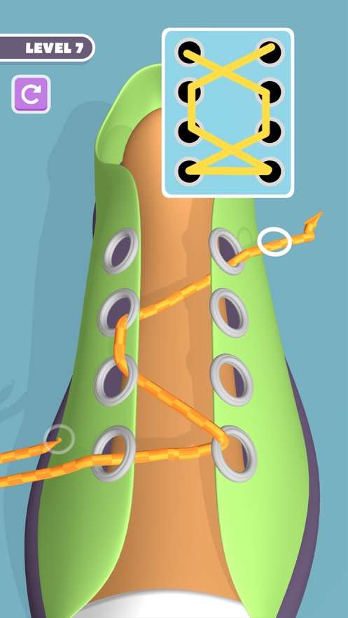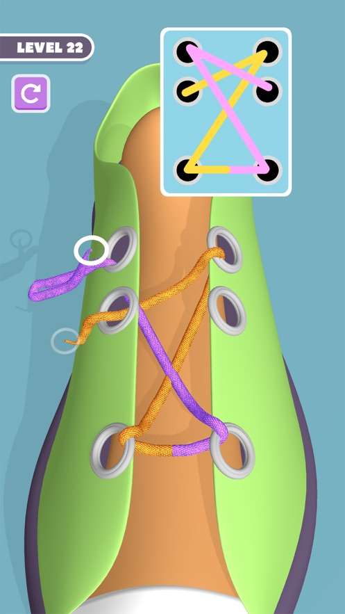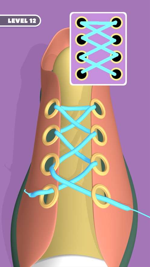 Tie Shoelaces游戏中会设计一些穿鞋带的挑战,每一次提供的鞋子都不同还有就是会向大家提供不同颜色的鞋带。根据挑战界面中显示的图案完成鞋带的编制,一开始的操作都会很简单简单的穿几下就可以完成一个跟图片上面一模一样的。之后的难度会慢慢的增加并开始提升自己的速度,越快获得奖励就会越多。可以去解锁新的鞋子还有其他颜色的鞋带。