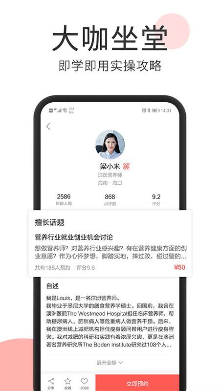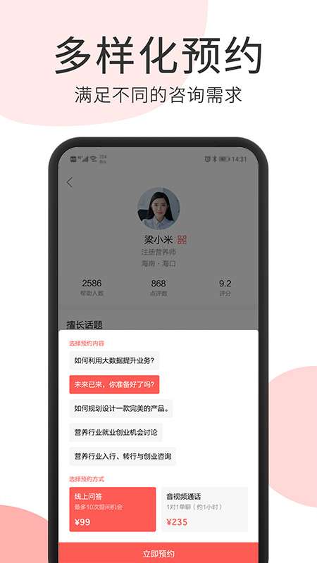 1、预约行家,用户可以在软件里面预约到行家,让用户可以满足自己的咨询。