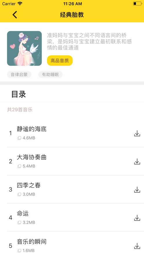 这款软件功能非常的强大,平台上涵盖了各个类型的音乐,还有大量的四书五经,让宝宝在肚子里就可以享受到中华文化的博大精深与美妙的音乐,培养孩子的艺术细胞,支持离线下载到手机上,让你随时随地与宝宝一同享受美妙的音乐哦。