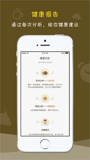 2.粪便分析:根据国际权威布里斯托便便分类法,从多个方面分析您的粪便,并提供健康建议和提醒。