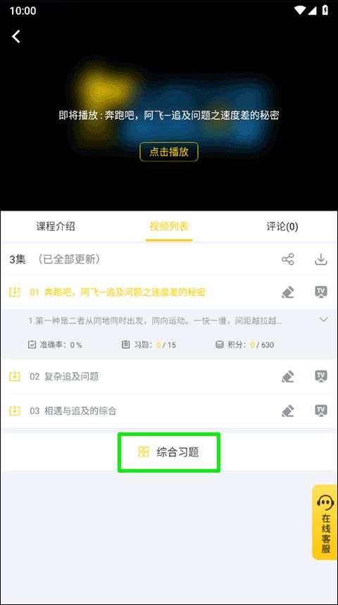2、然后,在具体课程中,同学们可以观看视频教学来学习相关知识,也可以找到并点击“综合练习”选项来做题巩固;
