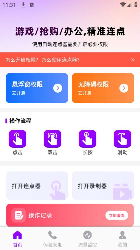 秒点连点器免费是一款为用户提供多功能实用工具的应用软件。该软件提供了一个强大的连点器,方便用户实时点击,更好地自动点击,就可让你进行多场景的点击,方便用户精准点击,快速完成各种重复性任务。该平台还支持用户设置模拟来电,可以伪装自己的来电,并可以通过设置来电信息进行模拟,从而更好地利用它,轻松摆脱尴尬的各方,让你真实模拟。此外,秒点连点器免费提供了许多非常好的功能,如浮动时钟、流量监控、测试手速度等。任意选择使用,轻松进行悬浮点击。