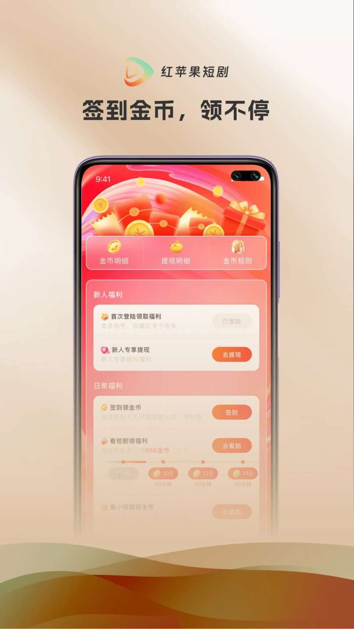 3、在福利板块内,通过签到、观看短剧、看小视频等方式领取金币,并按照规则进行提现。