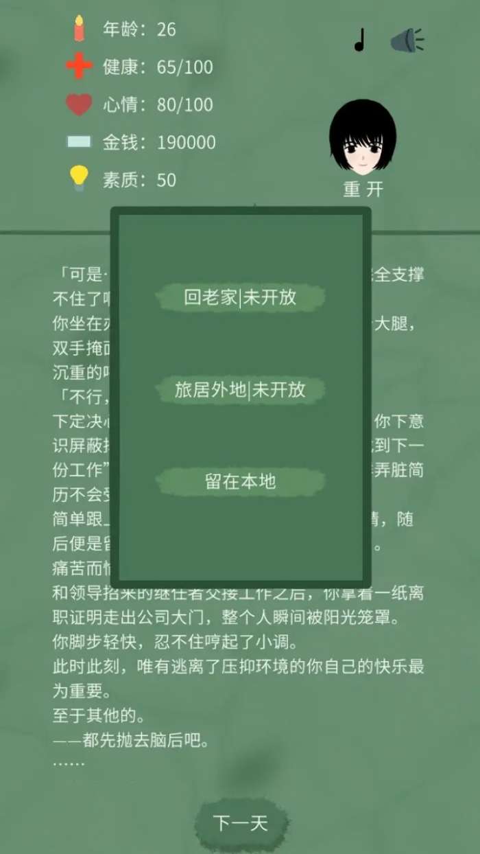 2、游戏中玩家将通过决策来决定自己的生活方向,可以选择创业、旅行、学习新技能,或者重新进入职场,每个选择都会影响故事的发展;