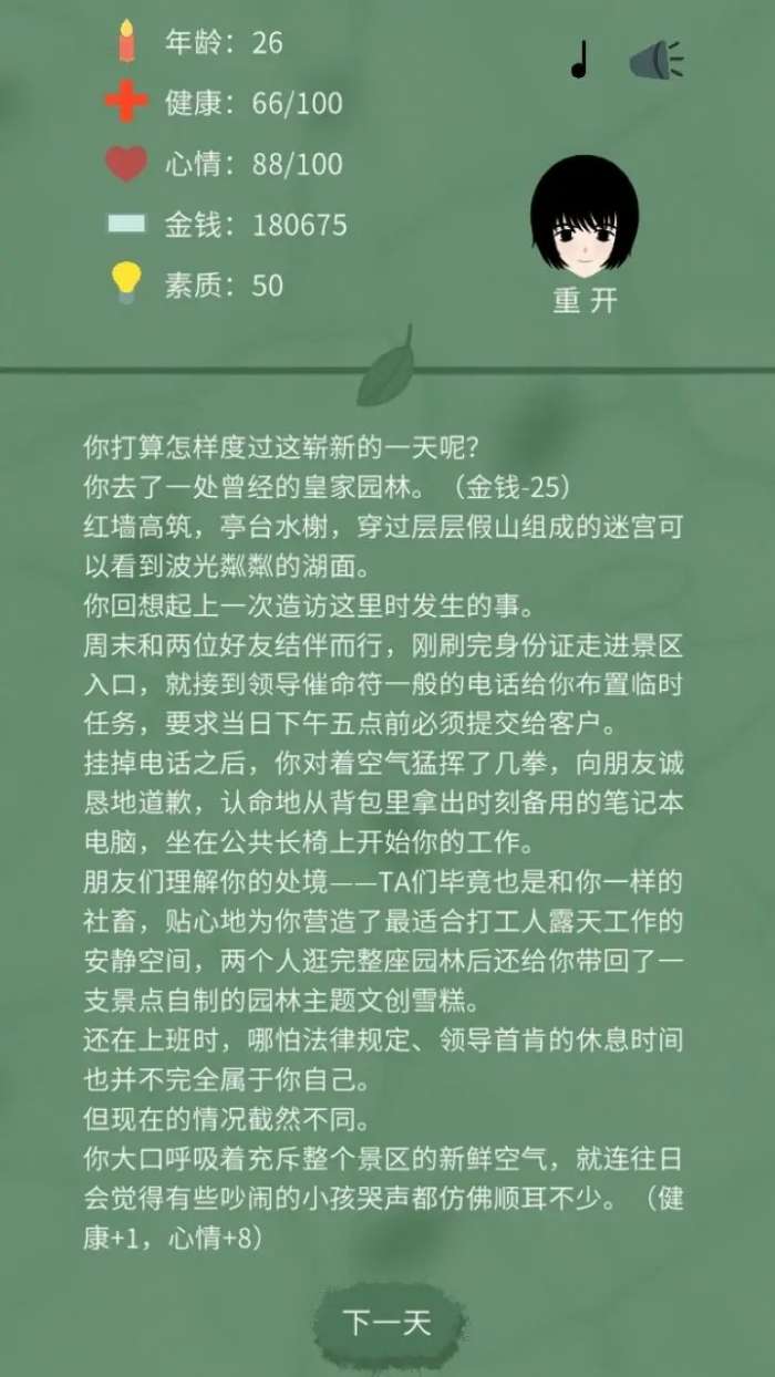 4、轻松愉快的游戏氛围,游戏的节奏适中,玩家可以自由探索各种生活方式,放松心情,享受休闲的文字冒险体验。