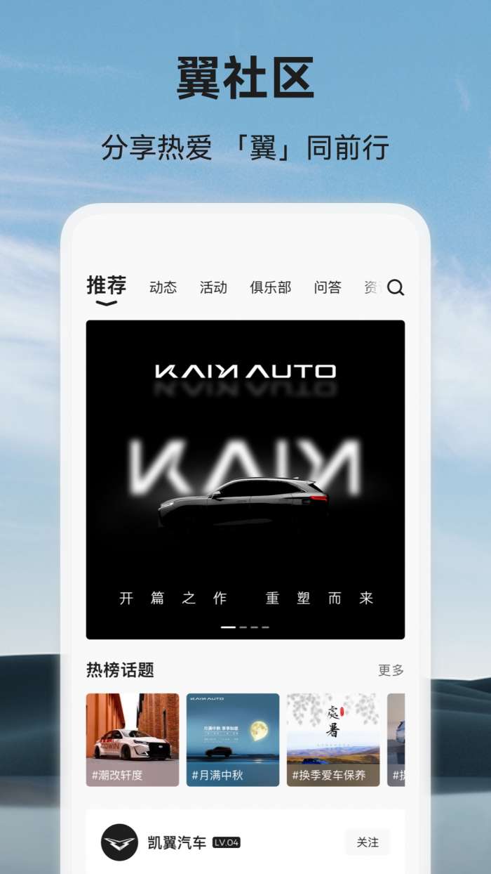 凯翼汽车APP更是凯翼汽车爱好者的专业互动乐园,在这里,凯翼车主用户可以第一时间获取凯翼汽车领域的权威一手内容,不错过任何精彩资讯;积极参与各式精彩纷呈的活动或比赛,展现个人风采;在线选购心仪的汽车商品,享受便捷购物体验;还能分享自己与凯翼汽车的动人故事,与志同道合的好友一起玩转凯翼汽车社区,共享汽车生活的无限乐趣。