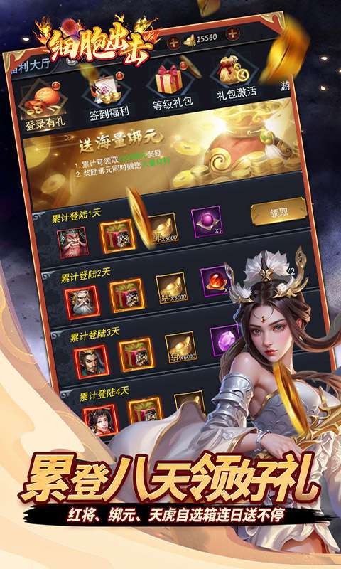 上线福利:        开局即送豪华礼:顶级自选金将、百抽招募令、神装箱、VIP经验轻松领(邮件内领取)        直升满级VIP19:邮件领取经验即用,尊享顶级特权一步到位        累登八天领好礼:红将、绑元、天虎自选箱连日送不停        每日签到享真充:天天领充值卡,连续签到惊喜再加码        升级礼包资源丰:升级送真充、武将、元宝,成长福利享不停