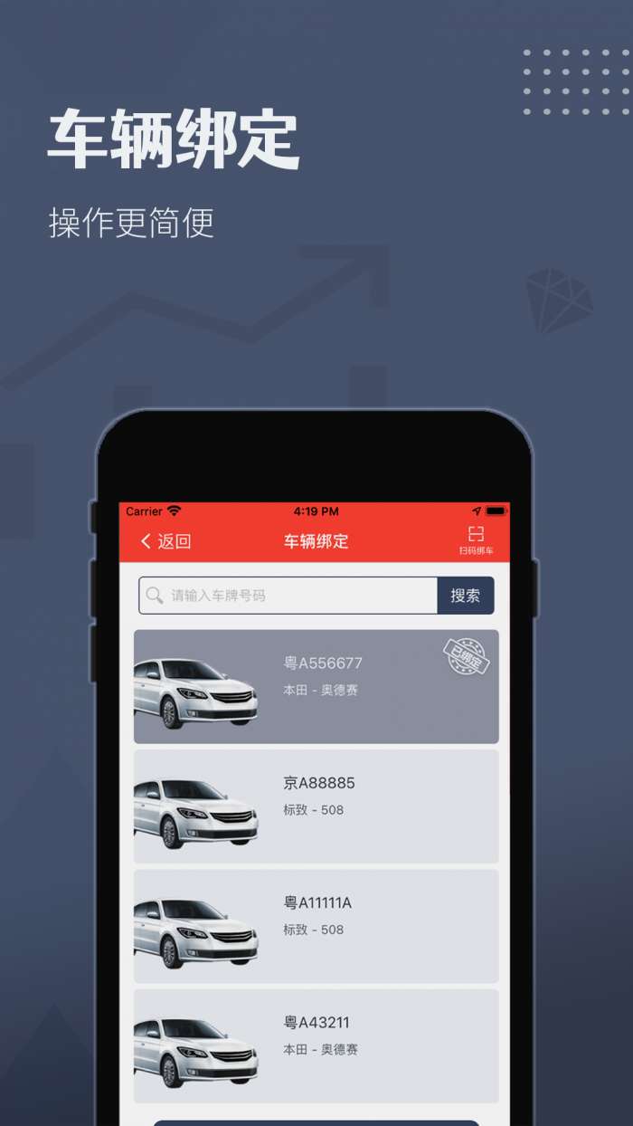 2、绑定车辆,使用车辆信息绑定功能绑定自己车辆档案或随时解绑。