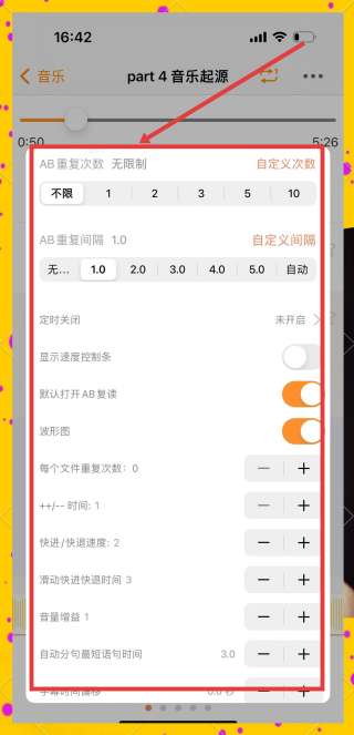 3、设置界面,针对part4音乐起源音频,可调整AB重复次数、间隔等多种播放参数。