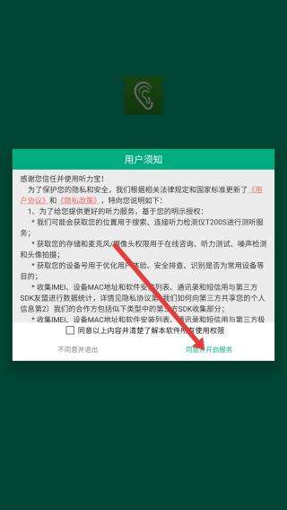 1、用户须知页面,告知隐私政策等内容,需勾选同意相关协议后点击同意并开启服务。