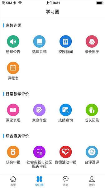 3、点击学习圈,选择家长圈子、获奖管理、综合素质评价等。