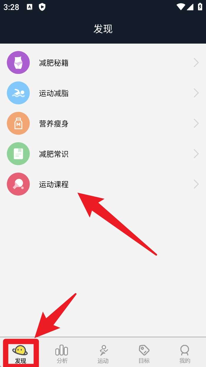 1、在底部菜单点击“发现”标签,进入后可选择运动课程、减肥常识等内容,获取运动与健康相关信息。