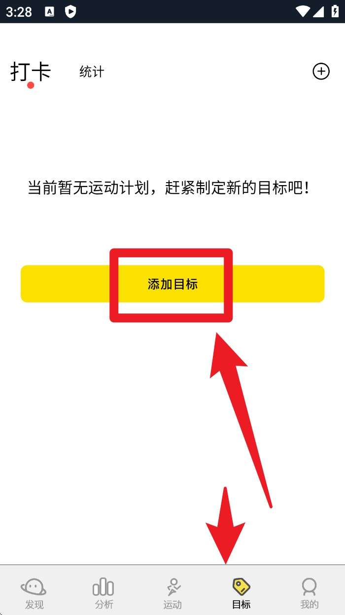 4、点击底部“目标”标签,进入打卡页面,点击“添加目标”设定新的运动计划与达成目标。