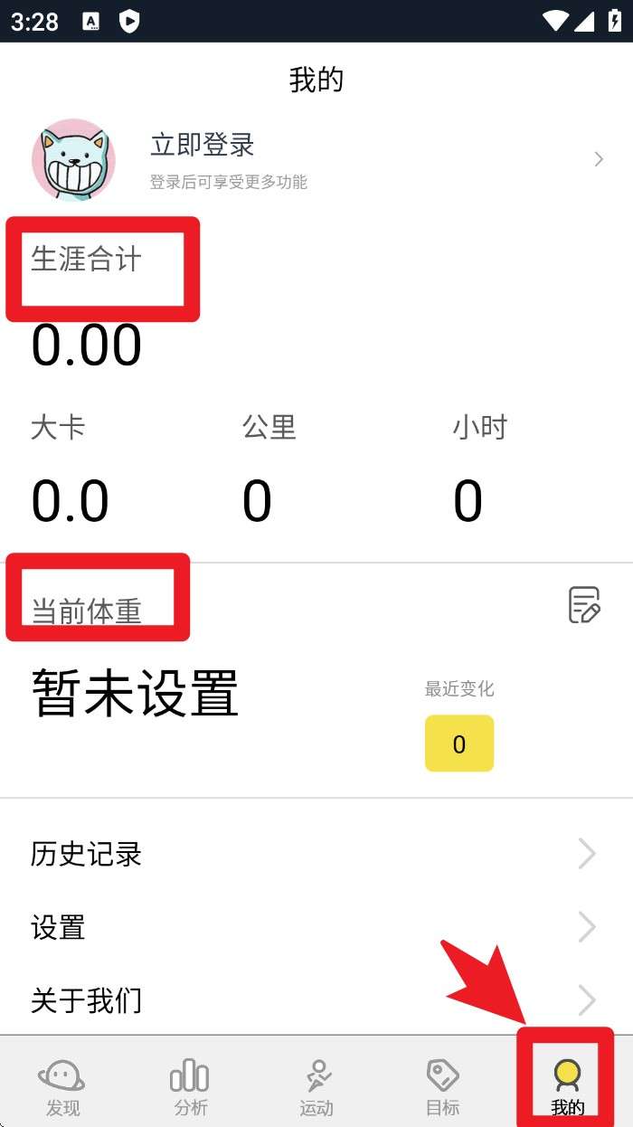 5、在底部选择“我的”标签,可查看生涯合计数据、当前体重及历史记录,便于长期追踪健康变化。