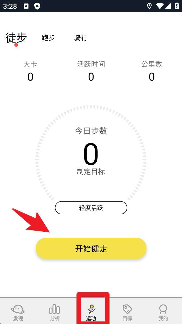 3、在底部选择“运动”标签,进入后点击“开始健走”按钮,开启实时步数与运动轨迹记录。