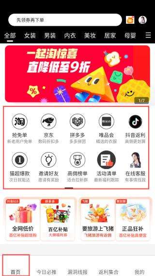 2、顶部有先领券再下单搜索栏,用户可通过首页快速访问各类功能和优惠活动。
