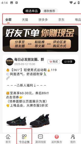 3、在今日必推界面,顶部有精选单品爆款推荐标签,下方有全部天猫拼多多京东唯品分类标签。