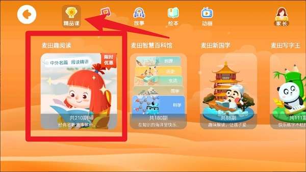 3、点击“精品课”中的“麦田趣阅读”,可进入阅读课程专栏,学习中外经典故事与表达训练。