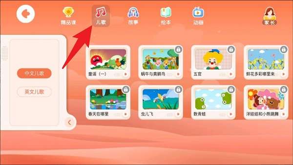 2、进入首页点击“儿歌”栏目,可选择中文或英文儿歌播放,激发宝宝语言节奏感与音乐兴趣。