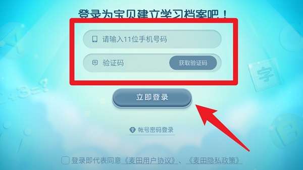 1、打开 App 后,输入家长手机号并获取验证码,即可快速为宝贝建立专属学习档案。