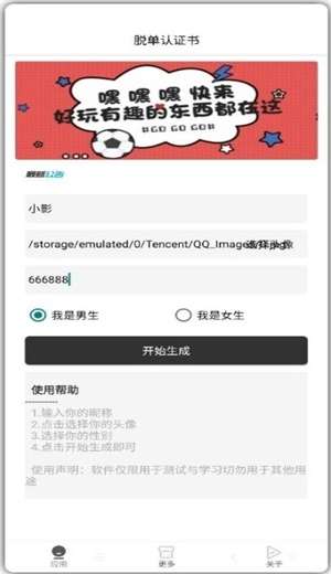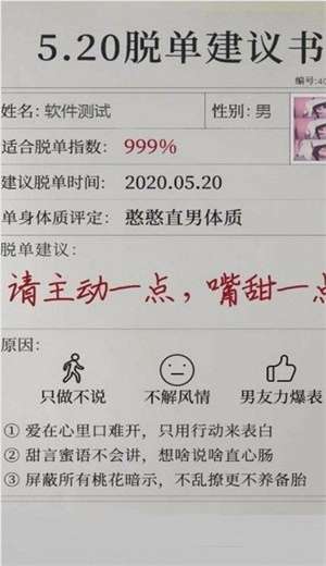520快到了,你找到自己的另一半了吗,如果还没有找到就快来下载这款脱单认证书app,这是这款非常有趣的软件,它可以帮你自动生成各种官宣的表情包,而且还有着大量的脱单活动,将自己的个人信息填写到软件上面,它会自动帮助你生成一张脱单建议,你可以将它分享到朋友圈中,让您的朋友看到。