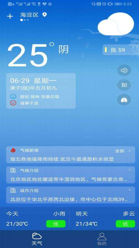 好运天气预报是目前非常实用的一款天气预报的软件,在很多用户出来工作之后都很少观看各种天气预报,而这款软件的主要服务内容就是能够帮助到用户快速的查看各种天气预报,通过这款软件,用户不仅能够查阅到未来几天的天气状况,还可以查阅到各种生活的指数,让自己在生活的过程当中能够更好地体验生活,并且还有相应的黄厉可以让用户在软件当中进行查阅查阅相应的管理,可以快速的了解该日期的各种适宜和禁忌事件